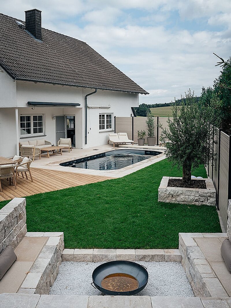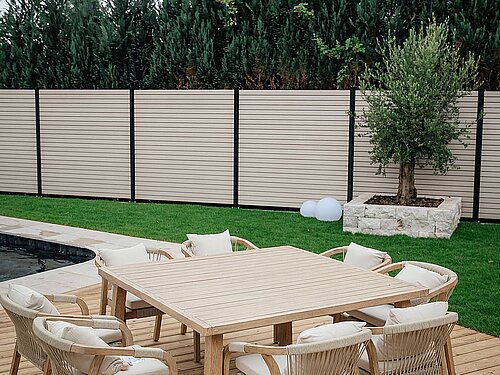 Rhombus-Sichtschutz in heller Ahorn-Optik an Poolterrasse