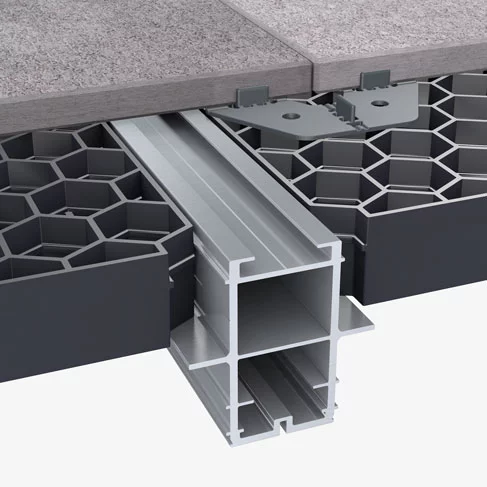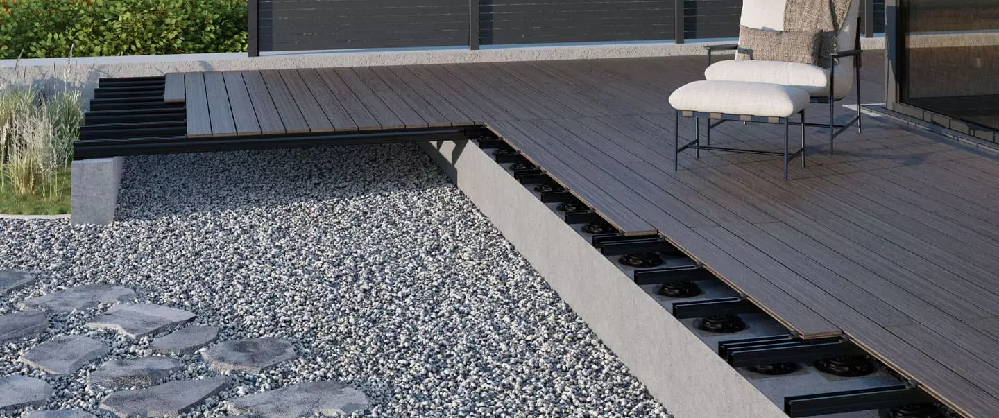 Aluminiumprofile lassen sich einfach sägen und bohren. Sie können daher flexibel an Bausituationen angepasst werden. TRIAS-Systeme bieten umfassendes Zubehör von unterschiedlichen Verbindemodulen („Connectoren“) bis zum Thema Entwässerung (Regenablaufgitter RAIN GRID etc.). Das System TRIAS ALU kann sowohl Dielen- als auch Plattenbeläge aufnehmen. Für dunkle Böden hat TRIAS die „Black Line“ entwickelt. Anthrazitfarbene Beläge werden immer beliebter. Mit der Terrassenunterkonstruktion TRIAS ALU in der Premiumoberfläche „Black“ sind somit keine Fugen-Blitzer zu sehen. Das Gesamtbild wirkt gleichmäßig und harmonisch.