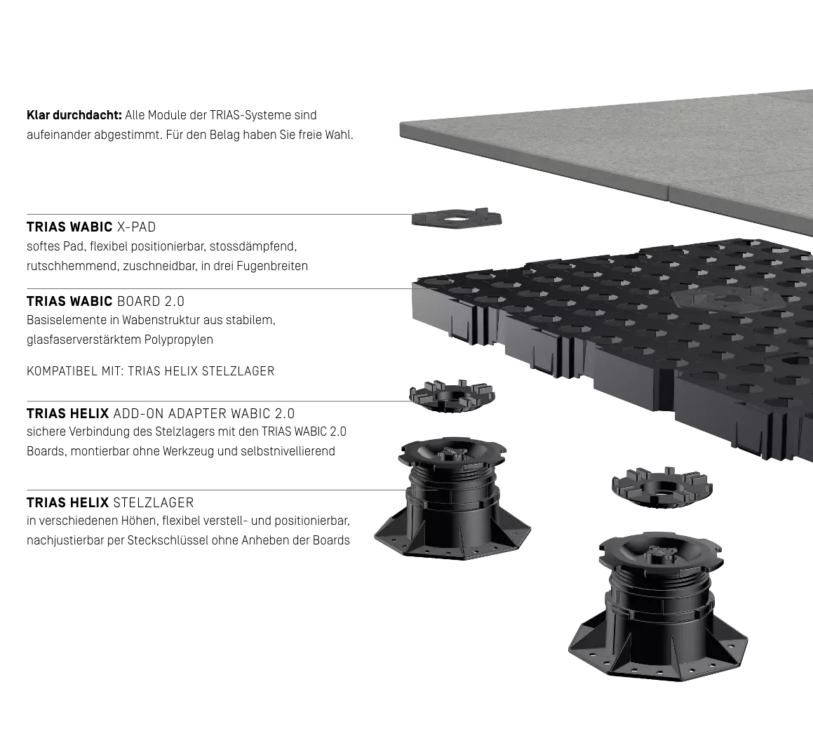 Die Kombination aus einfachem Handling, freier Belagswahl (Platten) und hoher Systemstabilität macht TRIAS WABIC 2.0 zu einer zukunftsfähigen Lösung für nahezu jedes Terrassenprojekt im Außenbereich.